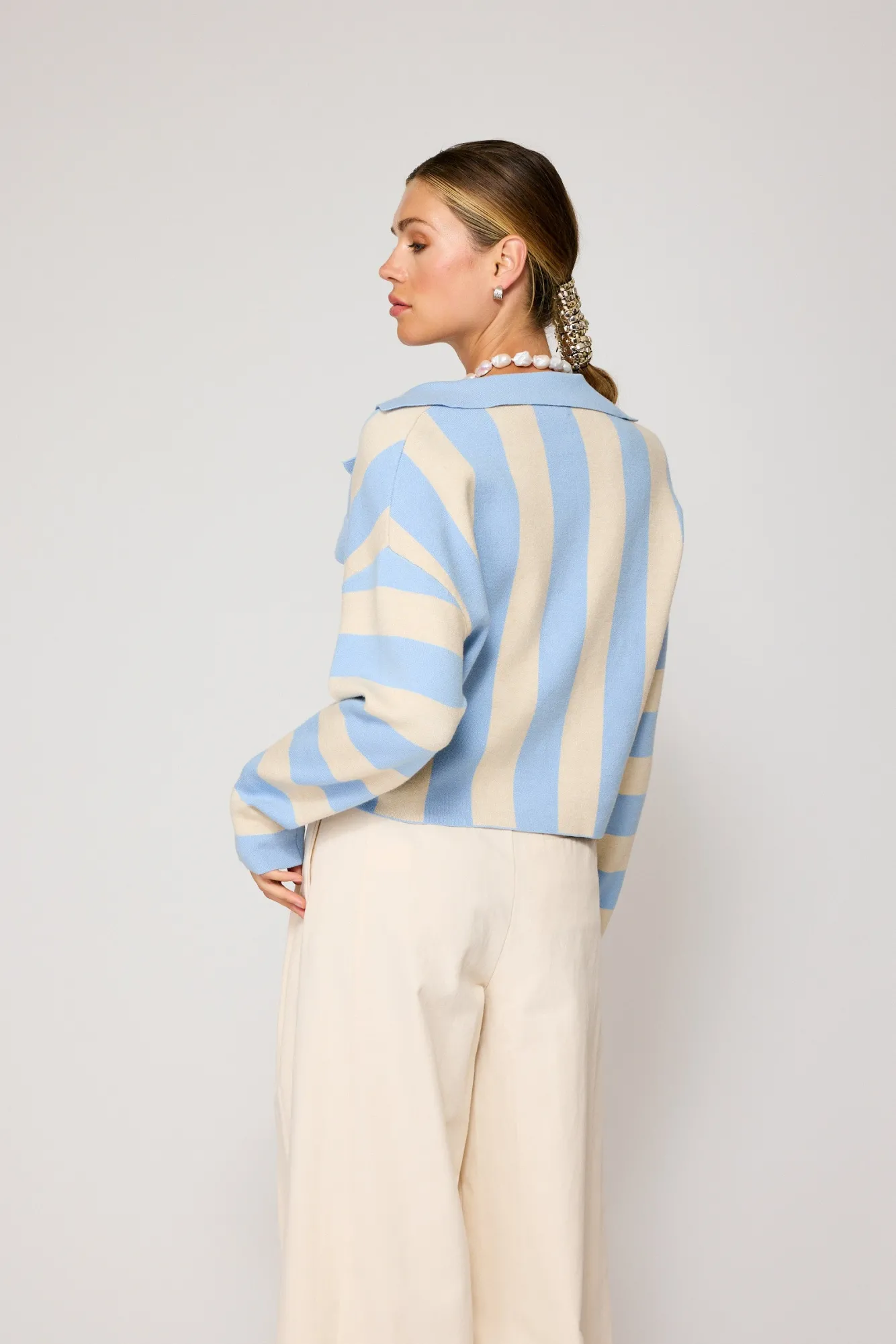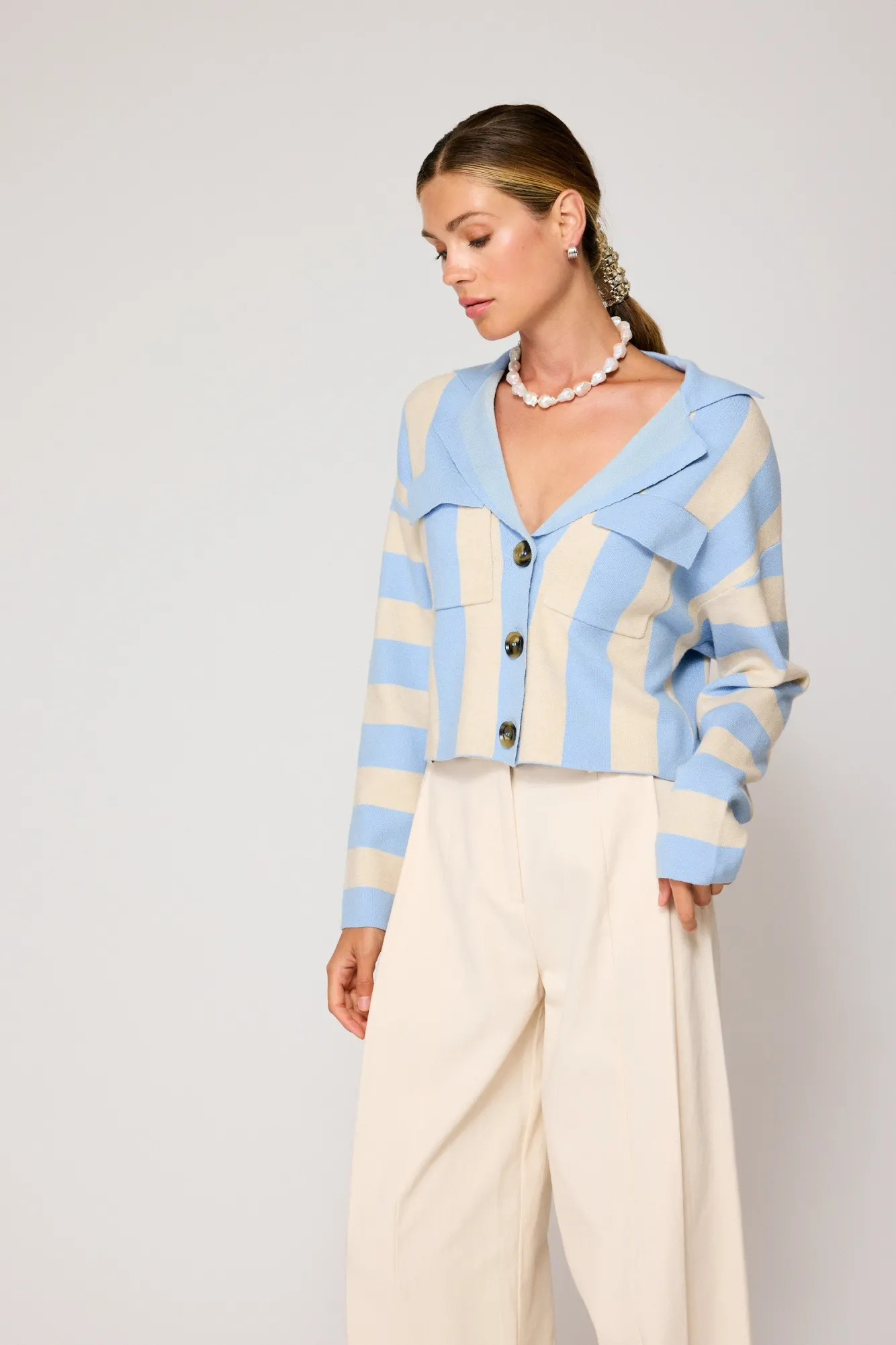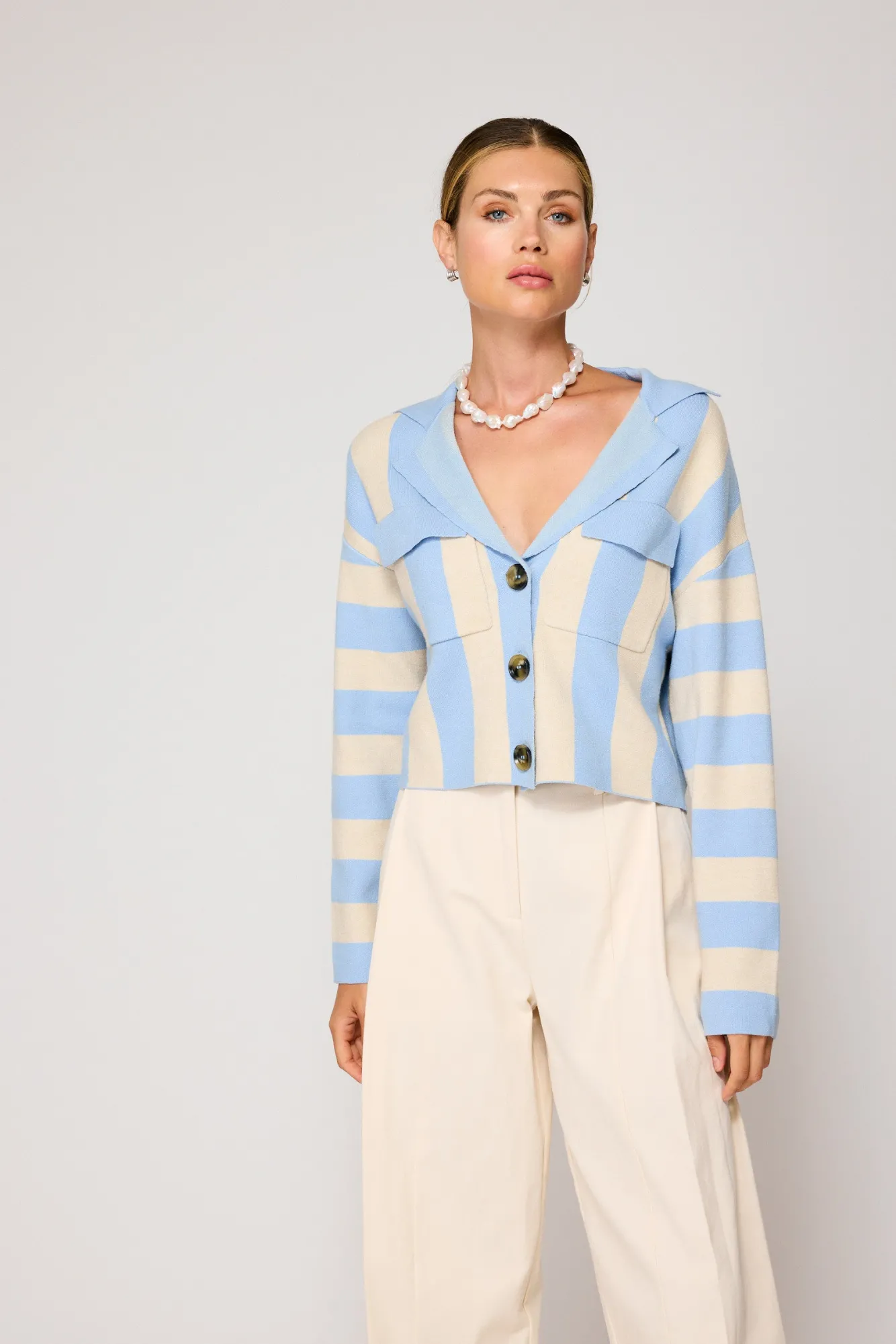 – Mid-weight knit sweater fabric- Striped pattern- Collared V-neckline- Fake flap pockets at front- Long sleeves- Button…