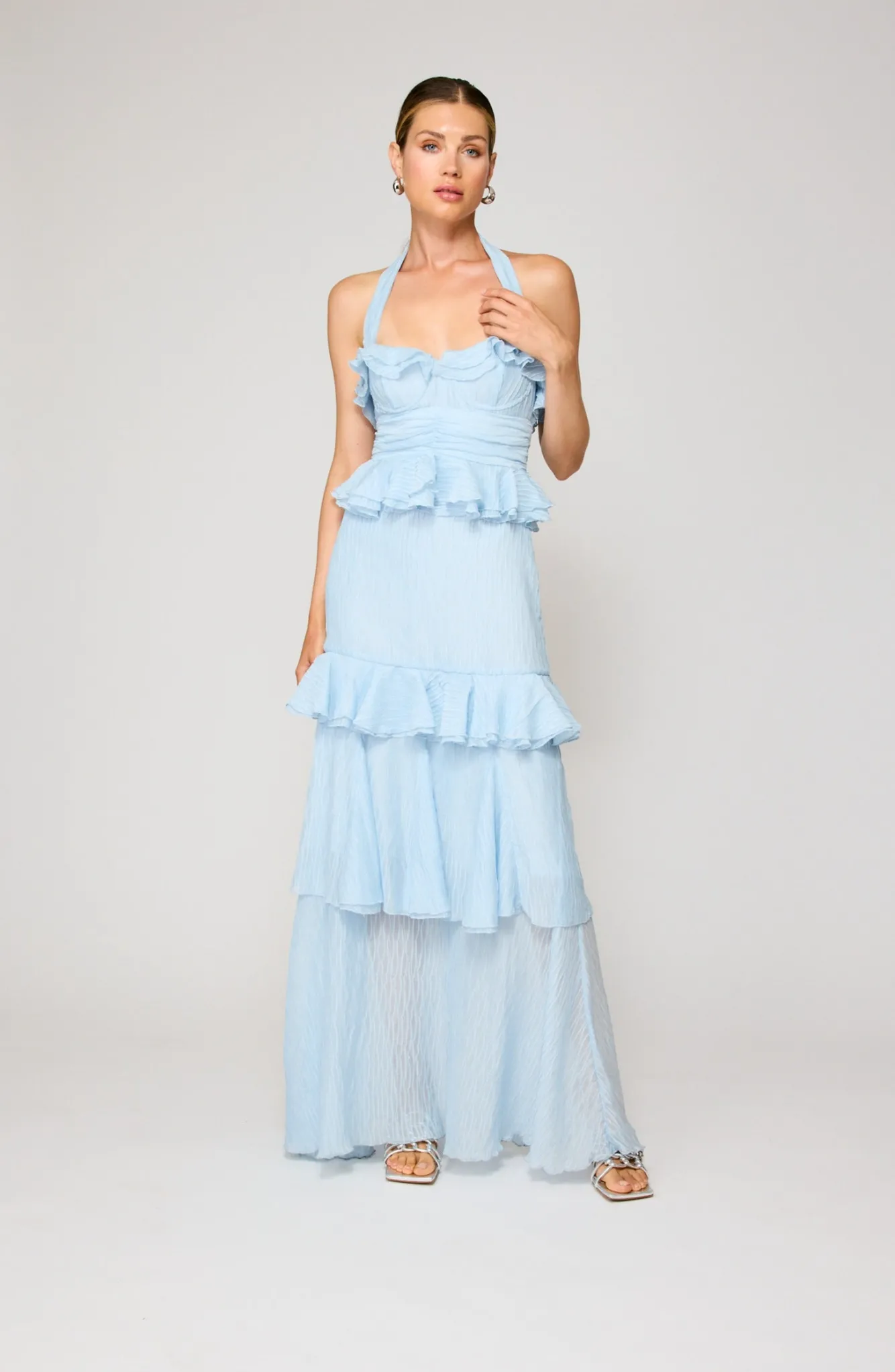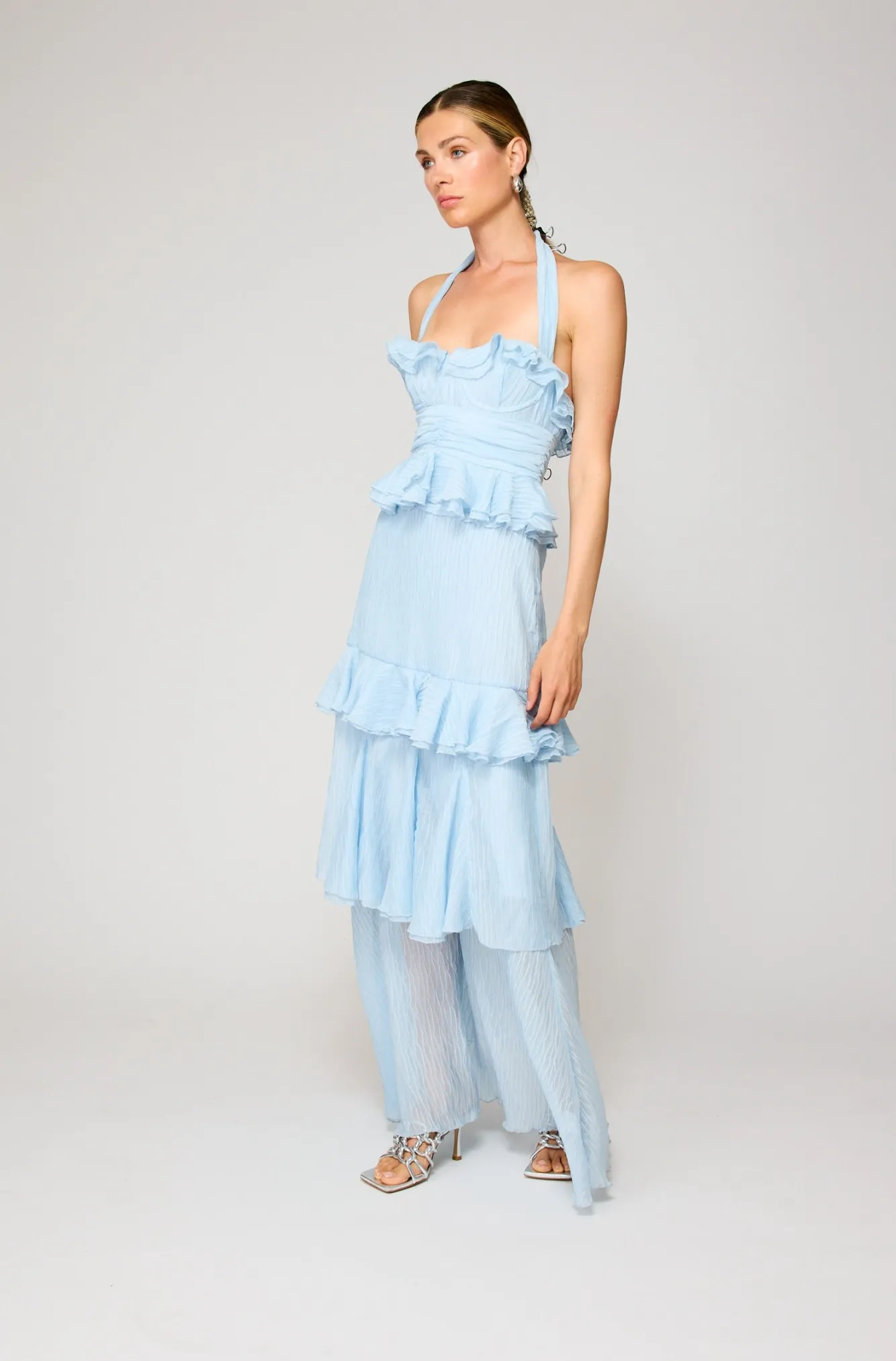 – Light-weight pleated georgette fabric- Adjustable halter neckline with button and loop- Ruffle detail- Hook-and-eye an…
