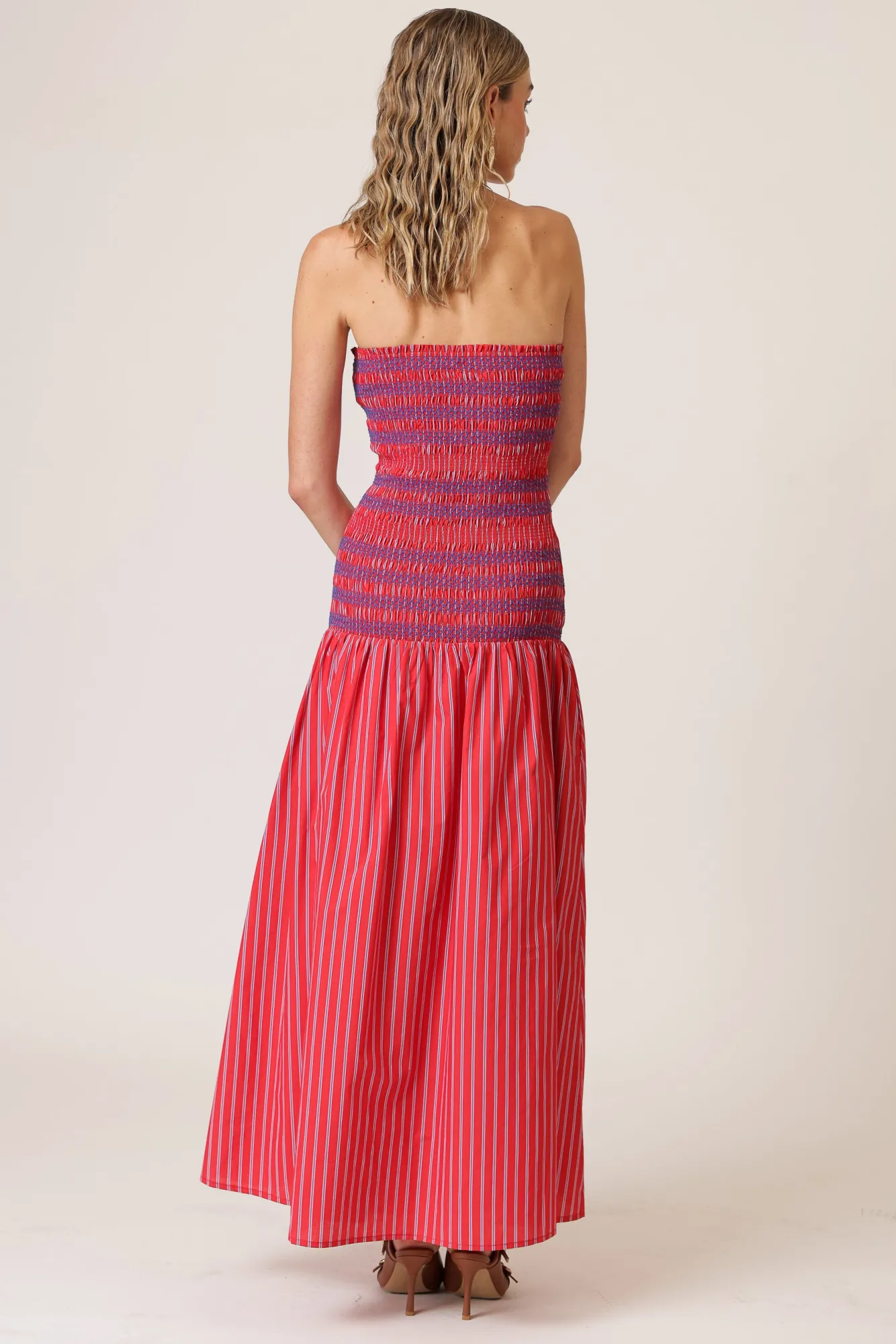 – Mid-weight poplin- Striped pattern- Strapless- Sleeveless- Smocked bodice detail- LinedModel measurements:Size SThe mo…