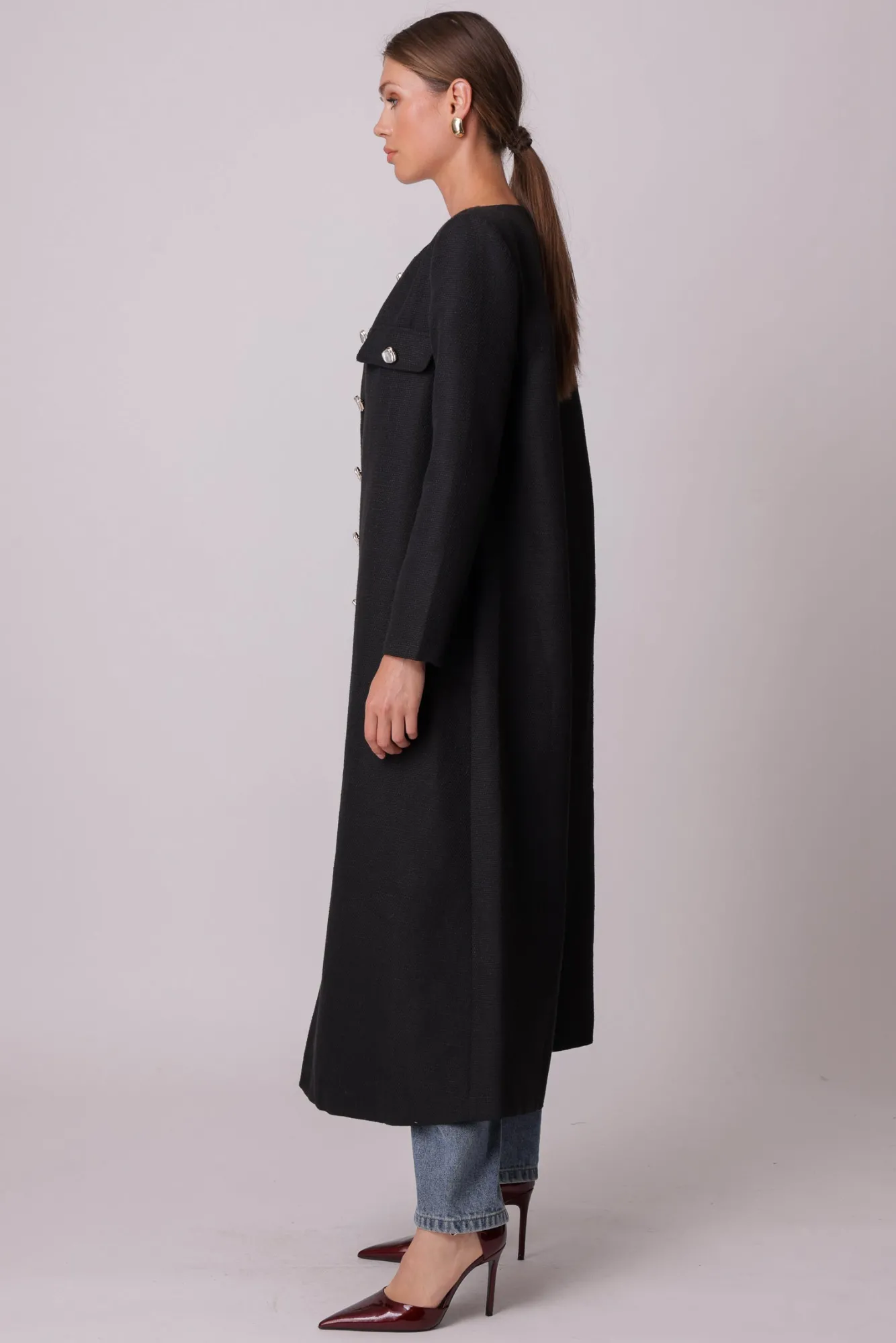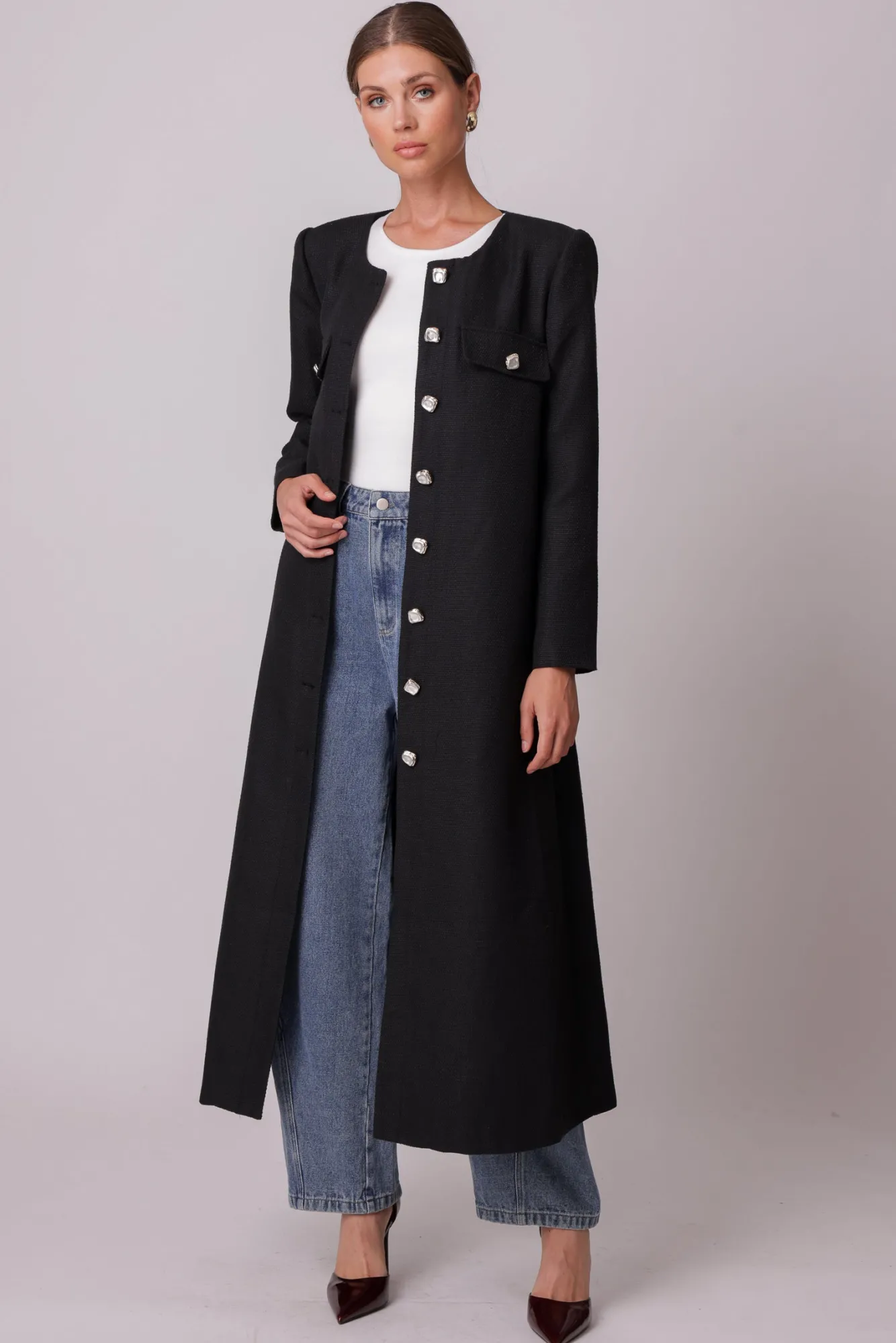 – Heavyweight, non-stretch wool felt- Long sleeves- Faux flap pockets- Button placket- Fully linedModel measurements:Siz…