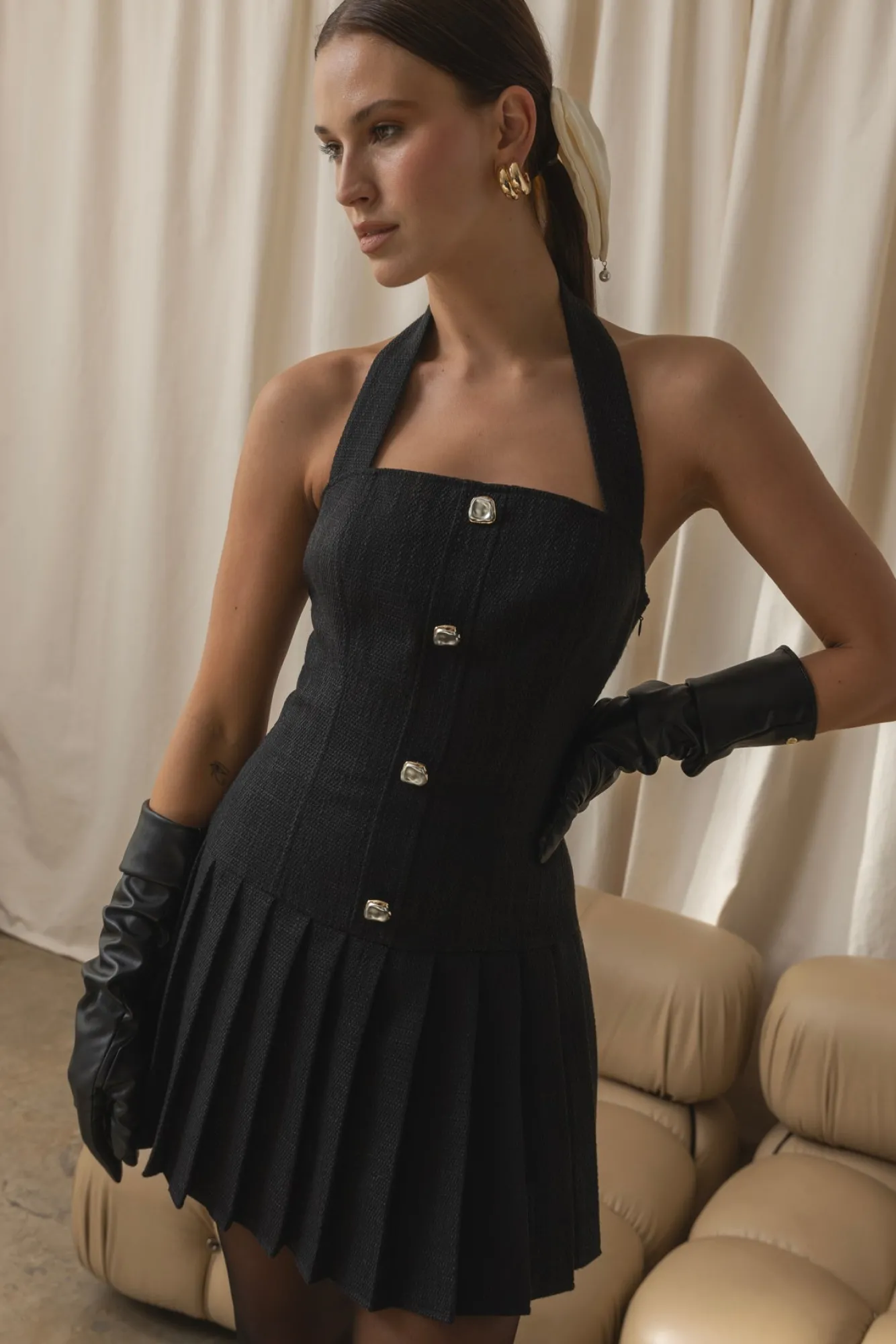 – Heavyweight, non-stretch wool felt- Halter neckline- Sleeveless- Pleated skirt- Decorative buttons at front- Hook-and-…