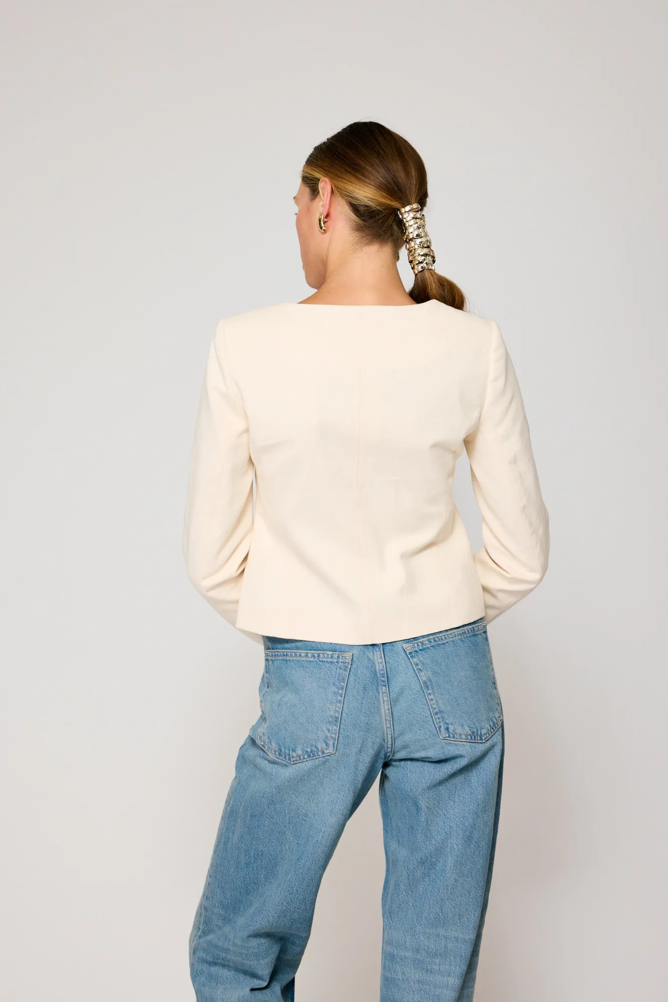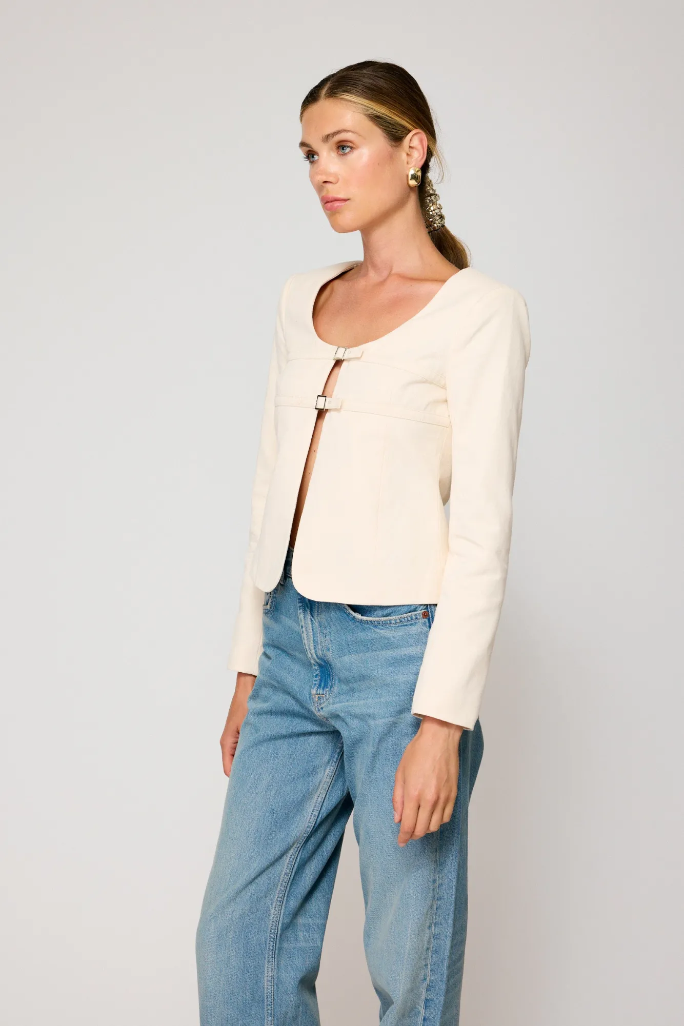 – Heavyweight cotton twill- Square neckline- Long sleeves- Buckle closure- Fully lined