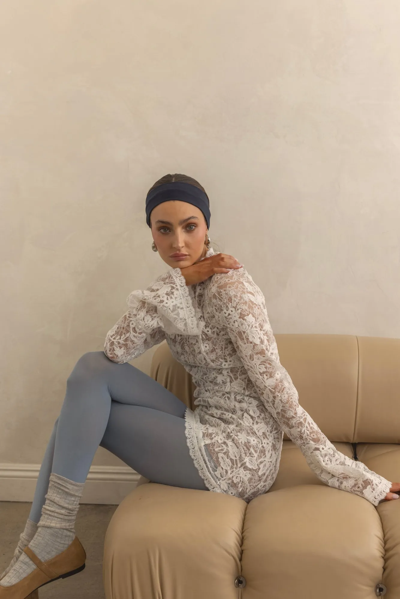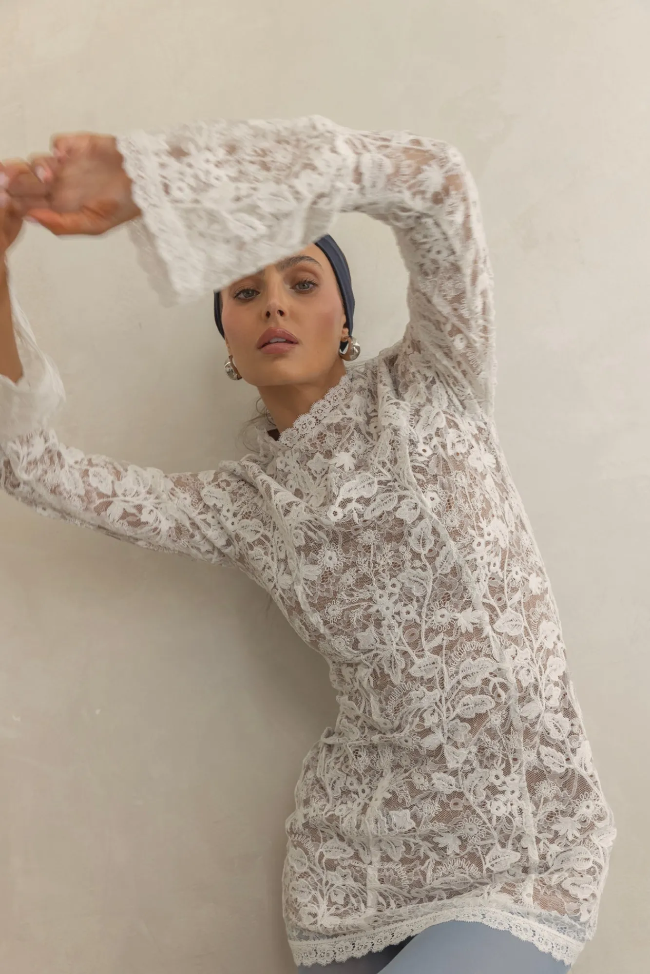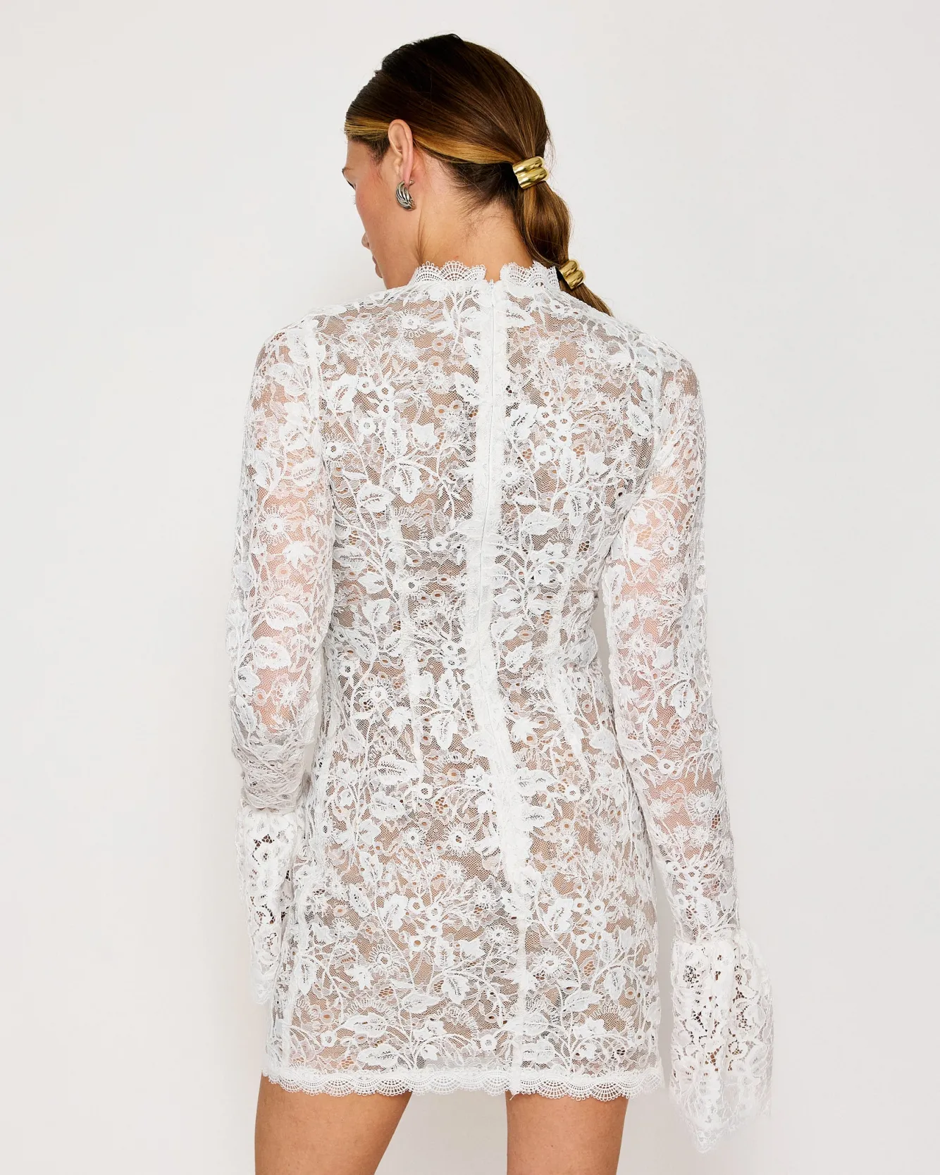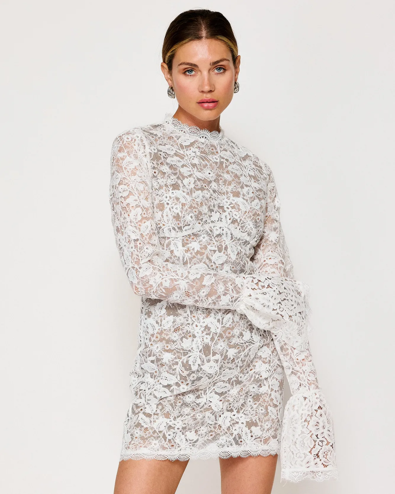 – Lightweight, non-stretch lace embroidery fabric- Lace trimmed neckline- Long bell sleeves- Lined at bodice- Hook-and-e…