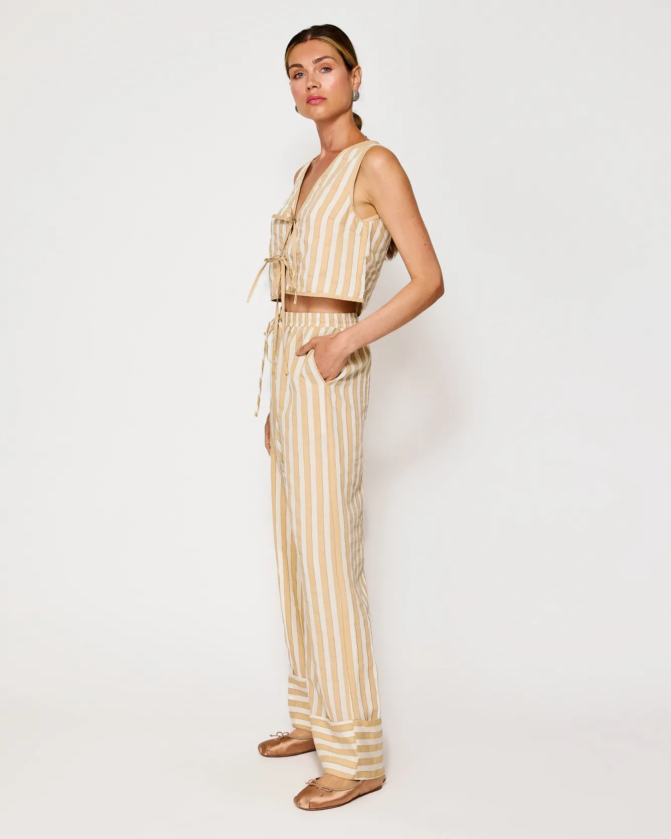 – Lightweight woven fabric- Striped pattern- Self covered elastic waist- Drawstring detail- Cuffed hemModel measurements…