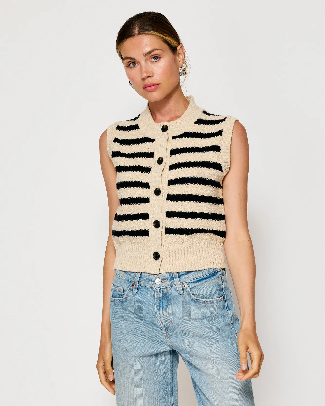 – Mid-weight knit sweater fabric- Striped pattern- Sleeveless- Button placketModel measurements:Size S: The model is 5’1…