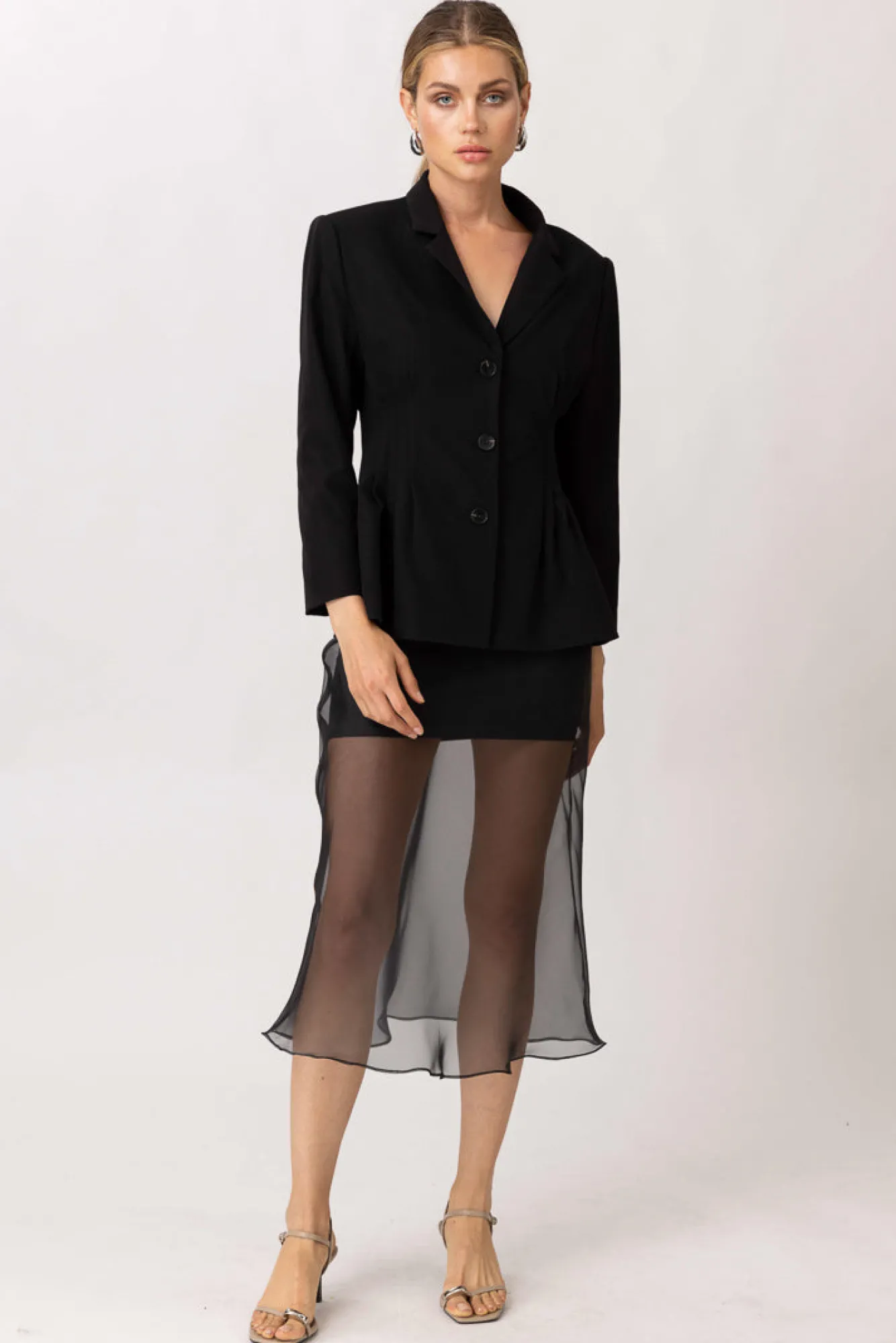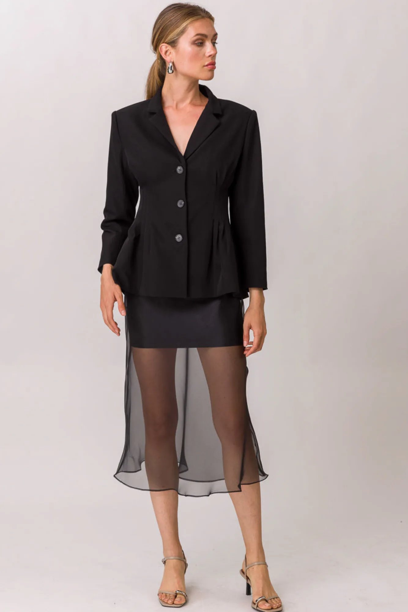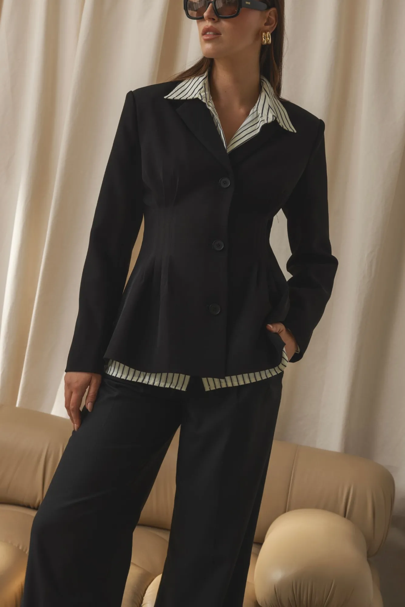 – Mid-weight suiting fabric- Padded shoulders-Notched lapels- Pleated detail at waist -Long sleeves with button cuffs-Si…