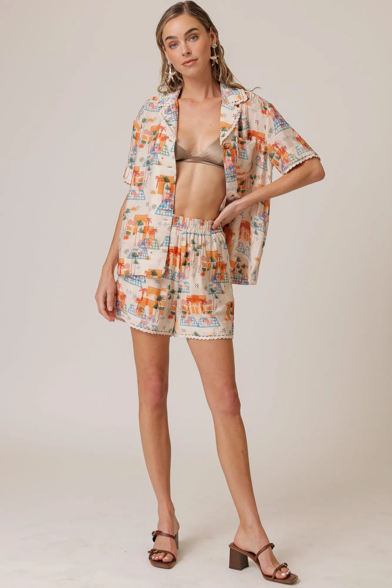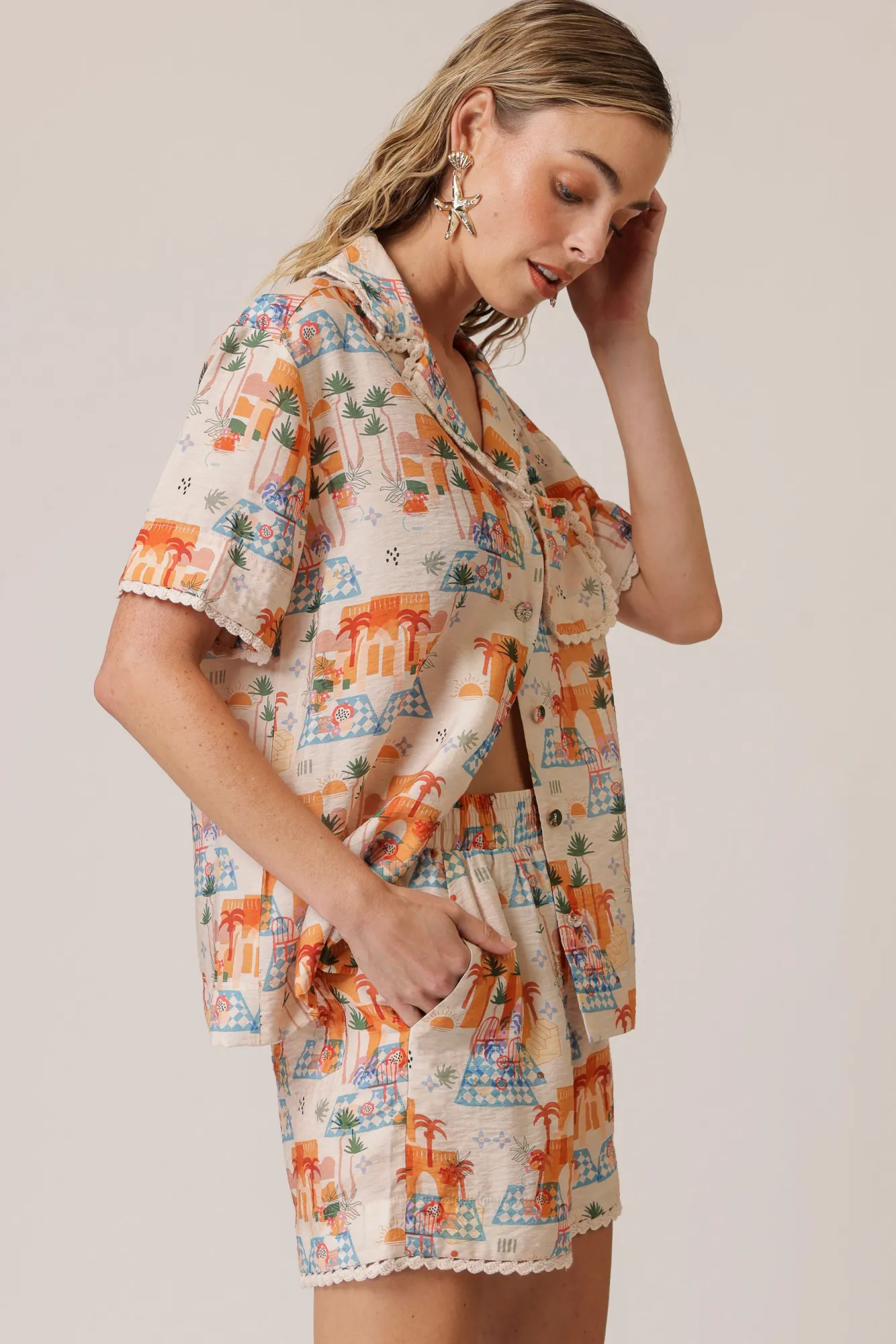– Lightweight woven print – Covered elastic waistband- Trim detailed- Slant hip pockets – Back patch pocket- Fully lined…