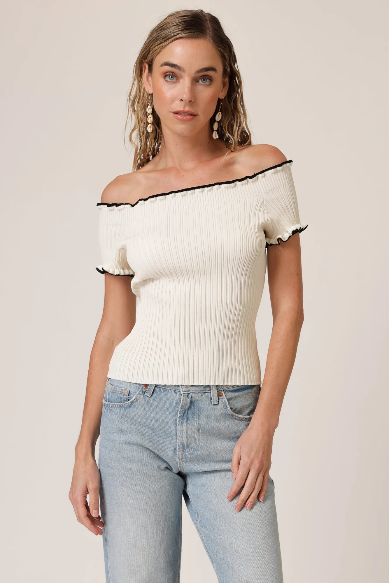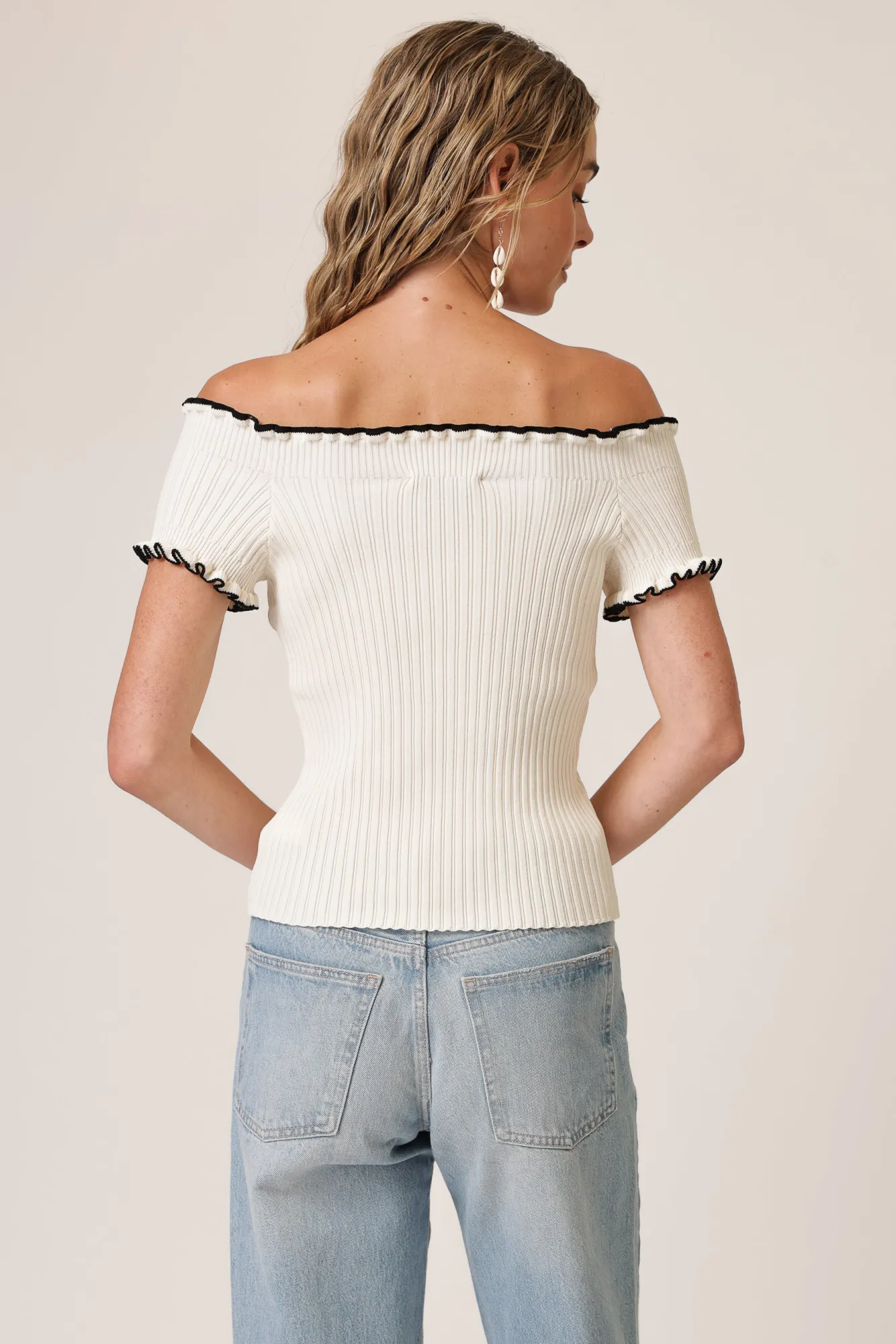 – Mid-weight ribbed sweater fabric- Off the shoulder design- Short sleeves- Pull over design, no closureModel measuremen…