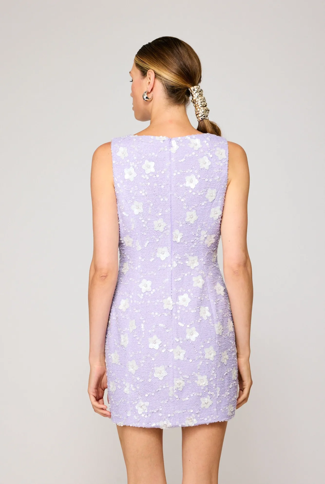 – Mid-weight sequins embellished tweed- Sleeveless- Square neckline- Fake welt pocket- Hook-and-eye and hidden back zip-…