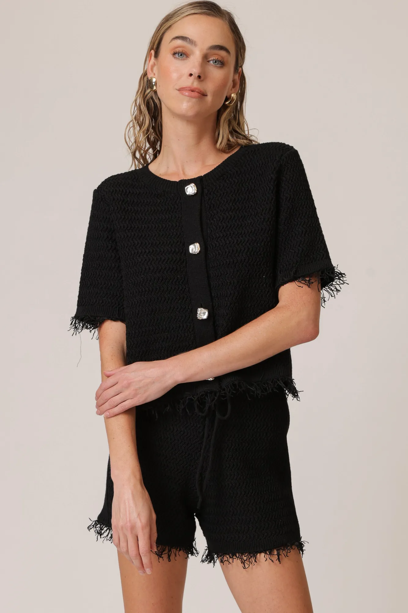 – Fringe detail along the leg opening