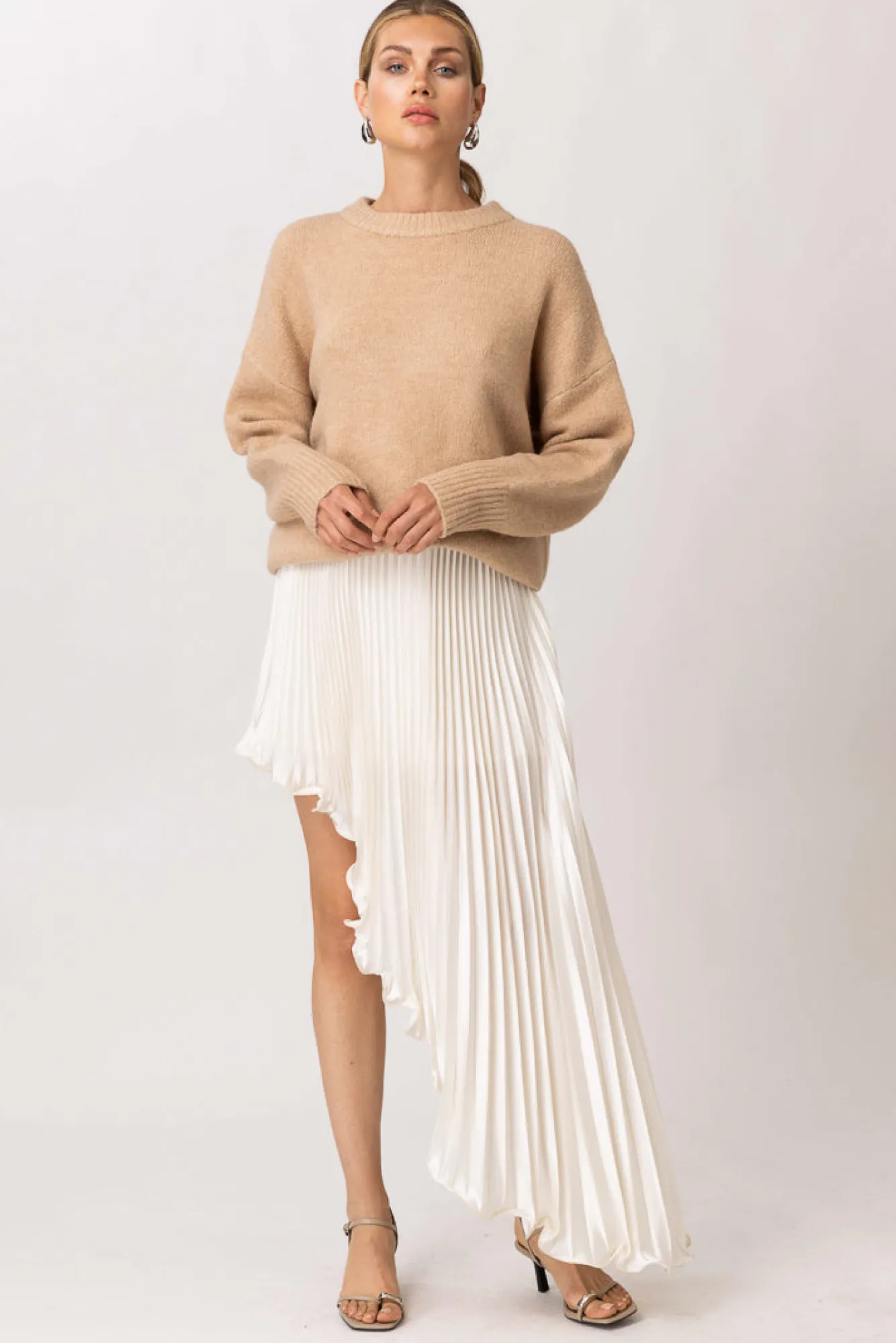 – Mid-weight satin fabric with little stretch- Asymmetrical hemline- Hook-and-eye and hidden side zip- Half lined