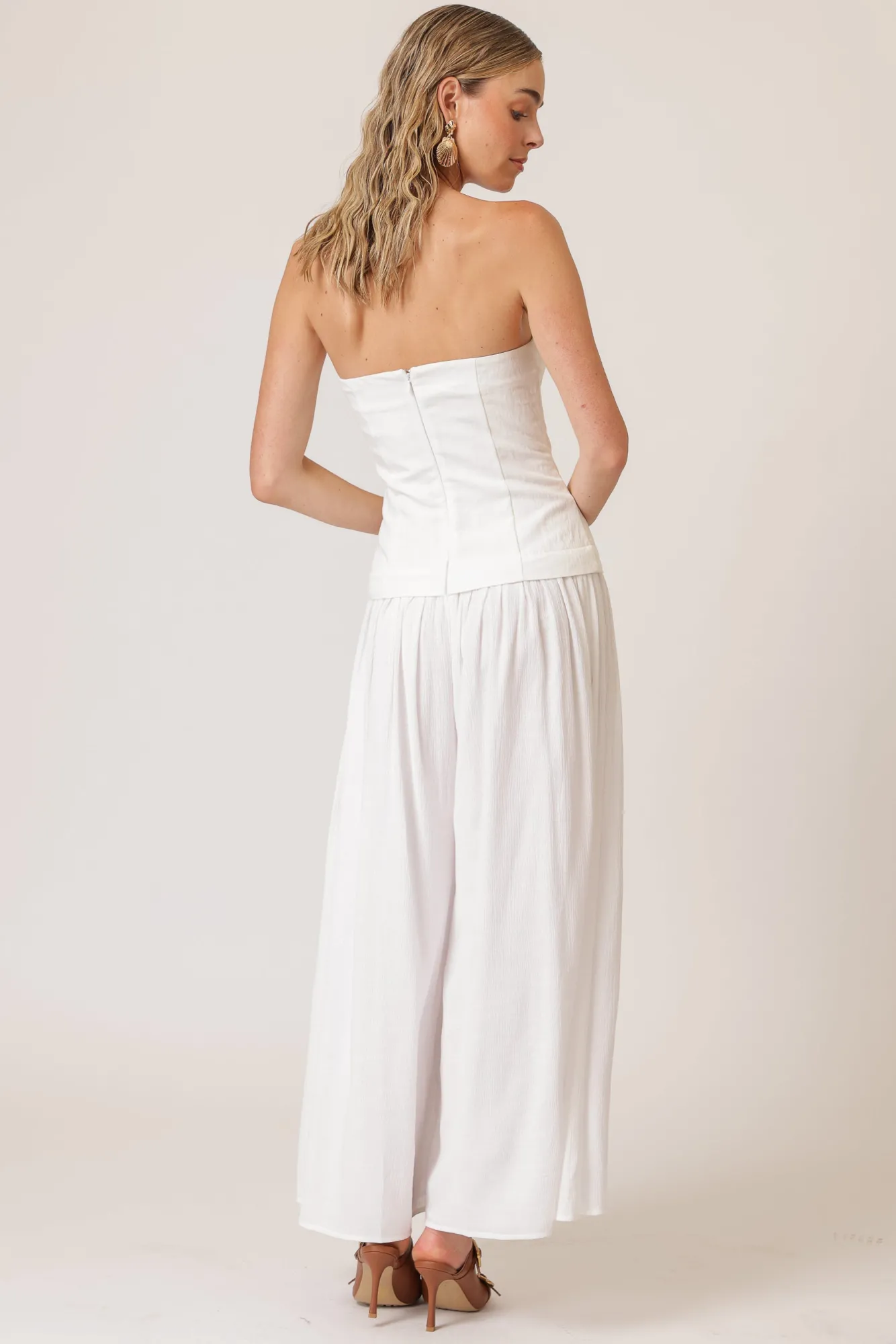 – Mid-weight woven fabric- Pants in lightweight flowy woven fabric – Strapless- Hook-and-eye and hidden zipper at center…